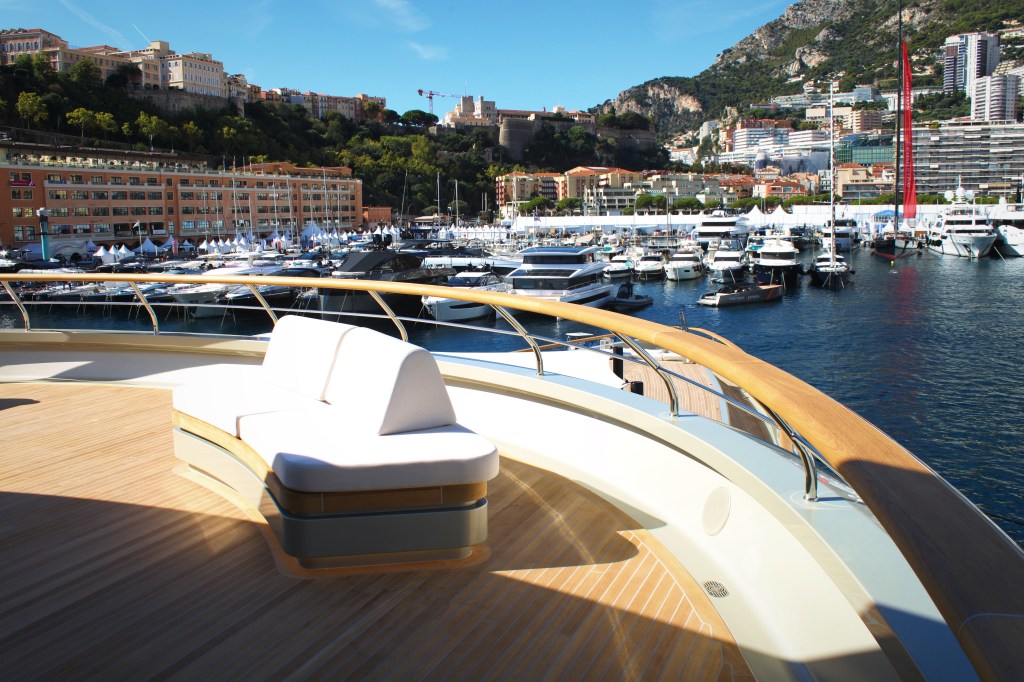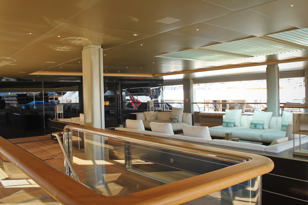 Below, the aft terrace offers shaded sitting spaces for intimate gatherings. Plush seating wraps around teak floors, blending comfort with architectural grace. The sunlight glints off glass balustrades, and the gentle sea hums beneath. From here, every conversation feels private, every hour stretched into serenity.
