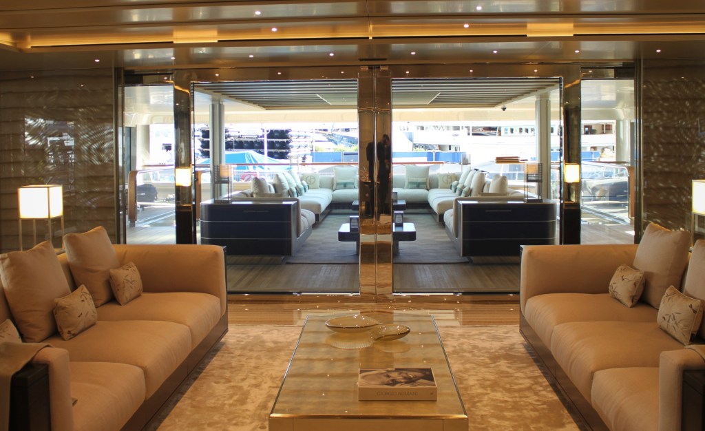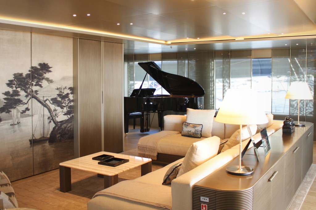 Inside, the relaxation room is a sanctuary of calm. Soft lighting, Canaletto walnut panels, and subtle fabrics form the backdrop. At its center, an automatic grand piano waits silently, capable of performing at the touch of a button, filling the salon with music that floats across the deck. Armani’s signature is in the restraint: nothing shouts, everything whispers.