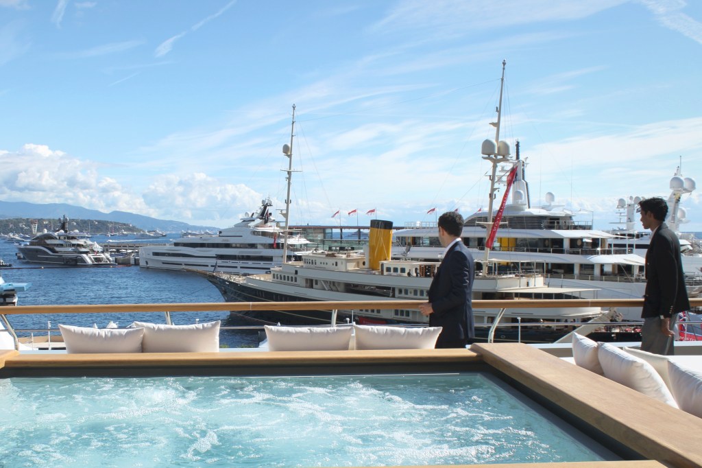 The aft-deck pool, shallow and wide, glimmers above the below-deck lounge. Sunlight passes through the water, refracting into liquid patterns across marble and teak surfaces. This is where design becomes poetry, where reflection literally becomes part of the interior experience.