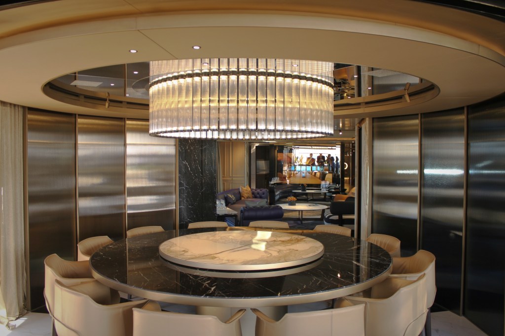 One of Raja’s most striking qualities is how it opens itself to the water. Wide beach club terraces, a folding balcony in the owner’s suite, and full-height glazing blur the line between interior and exterior. From the balcony, guests can watch the harbour unfold with an unbroken horizon, enjoying a sense of intimacy with the sea that few yachts of this size deliver.