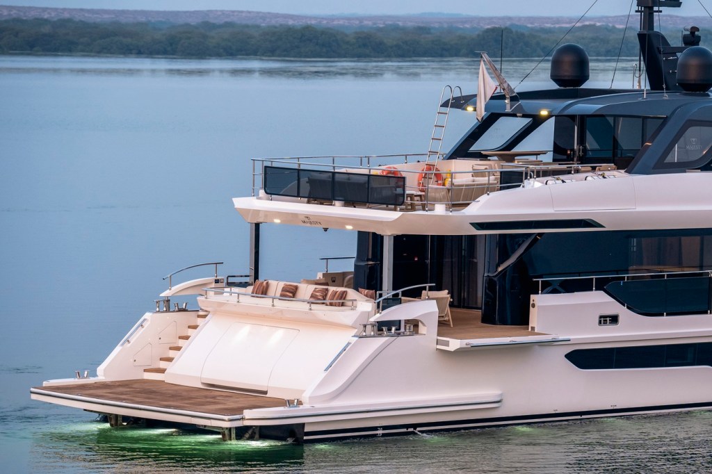 At 32.25 metres in length, the Majesty 100 Terrace carries a graceful, contemporary profile. Her beam of 7.2 metres and shallow draft of just 1.87 metres give her agility and access to a wide range of cruising destinations. Constructed from GRP in a semi-displacement configuration, she is engineered for comfort and stability.