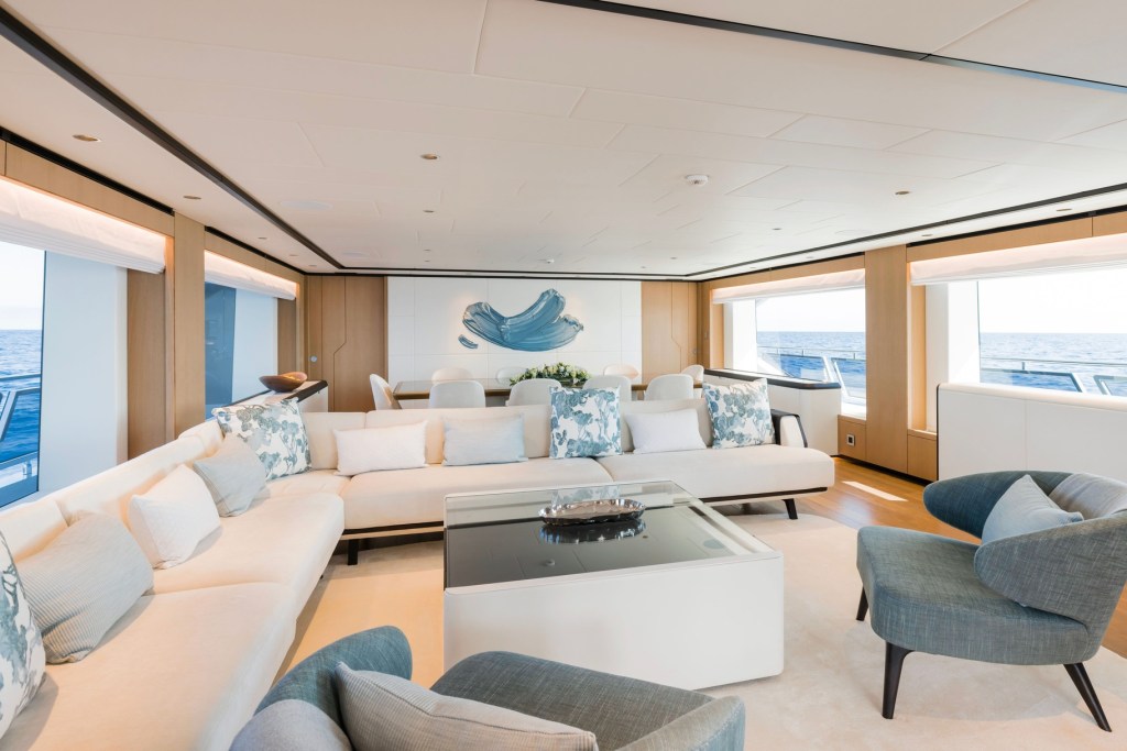 Stepping aboard the Majesty 120, you immediately sense her balance between volume and intimacy. The interior, designed by the Italian studio Cristiano Gatto Design, exudes modern elegance with a calm, sophisticated atmosphere. Spaces flow naturally, and large windows invite light into every area.
