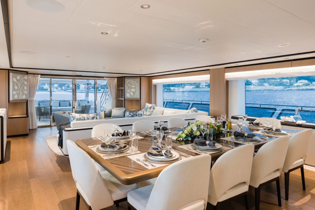 The main deck features a generous salon and dining space with seamless views of the sea. The master suite, located forward on the same level, benefits from wide glazing and a bright, private setting. Below deck, five guest cabins continue the same aesthetic of light tones and refined finishes. Throughout, the design focuses on comfort and practicality, with carefully planned crew areas ensuring discreet service and smooth operation.